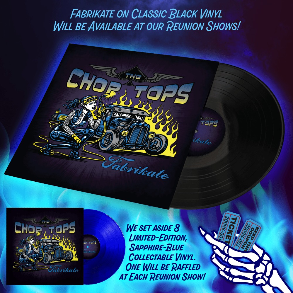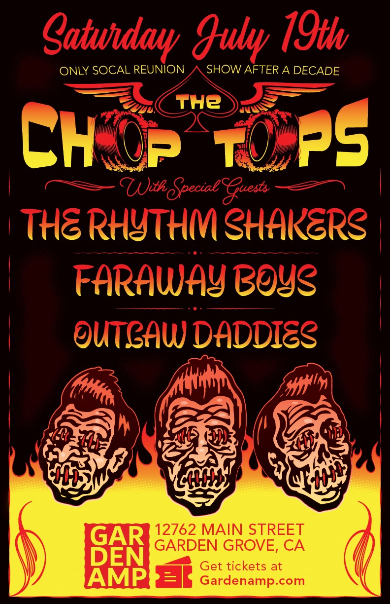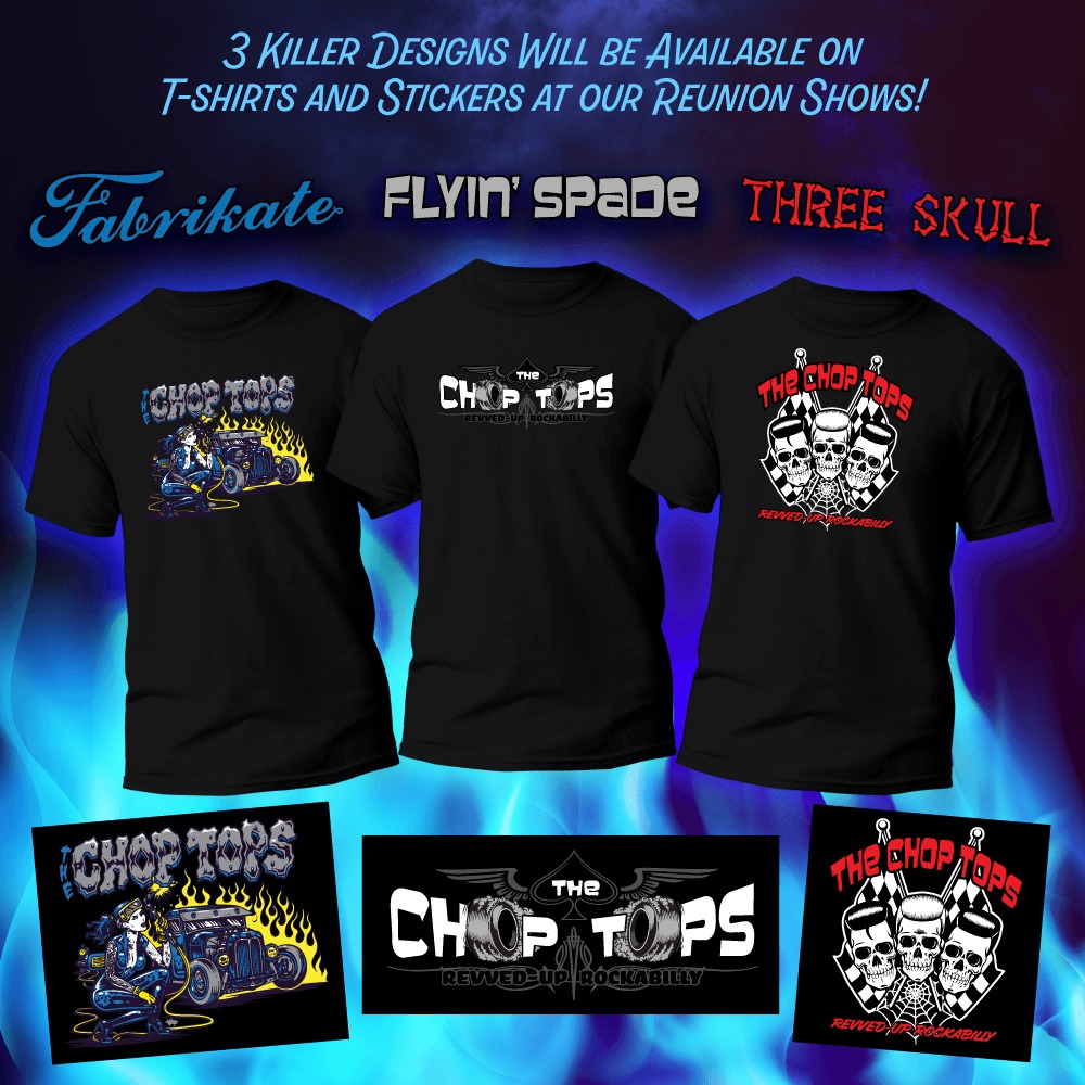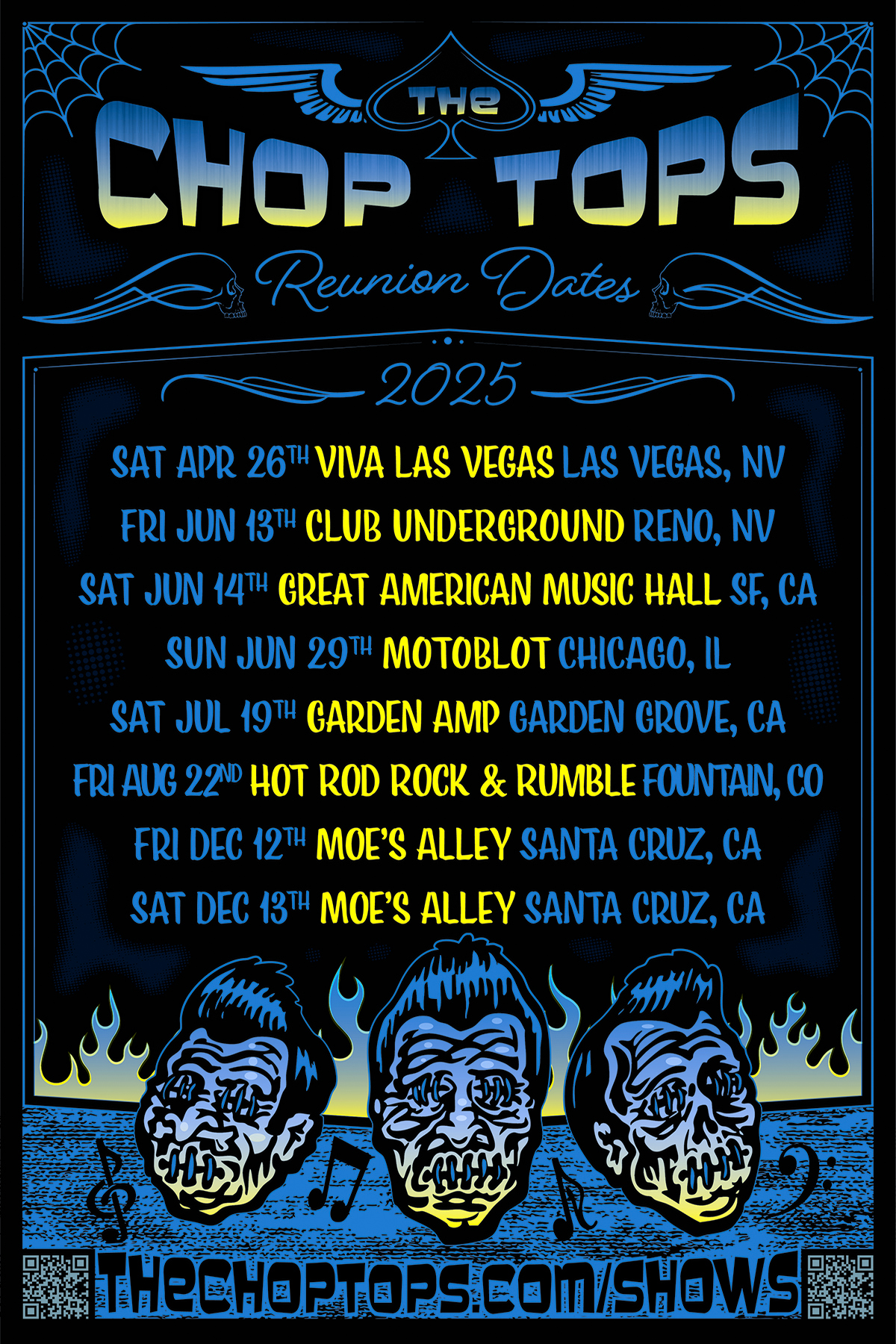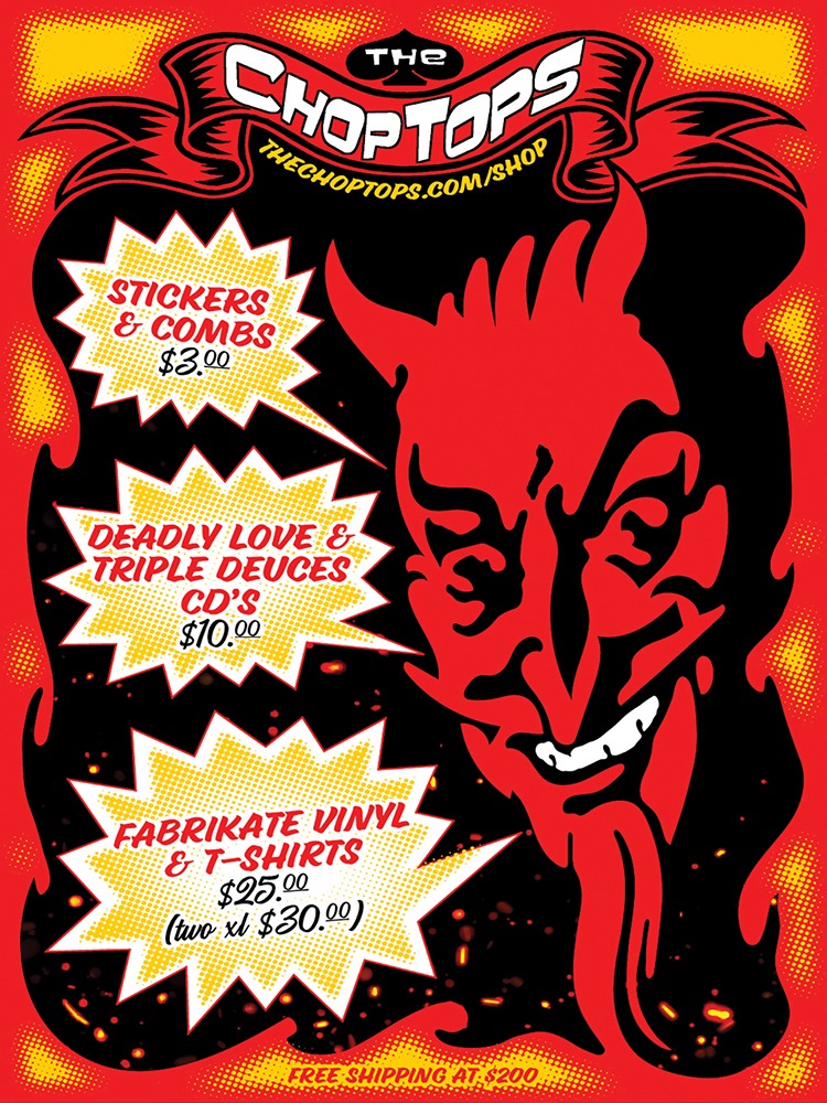RESULT: A fantastic vinyl record jacket and label were created. An updated website was launched. Three eye-popping, jaw-dropping designs were laid out on T-shirts and stickers. And a full year-long campaign of promotional print, and social media ads and videos for their reunion events were produce succsefully darwing sold out audiences. See the website: thechoptops.com
