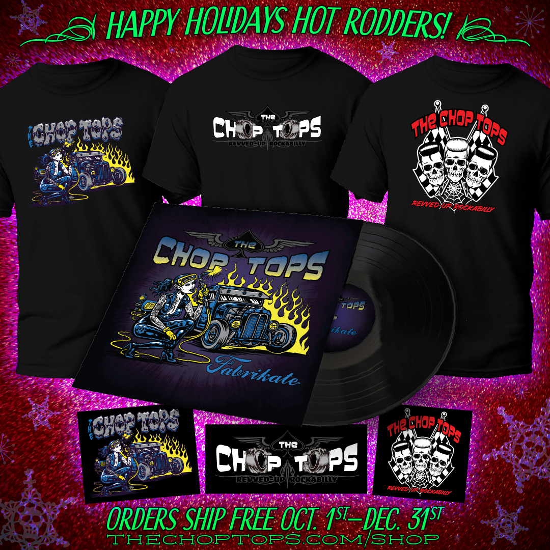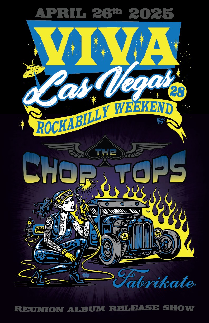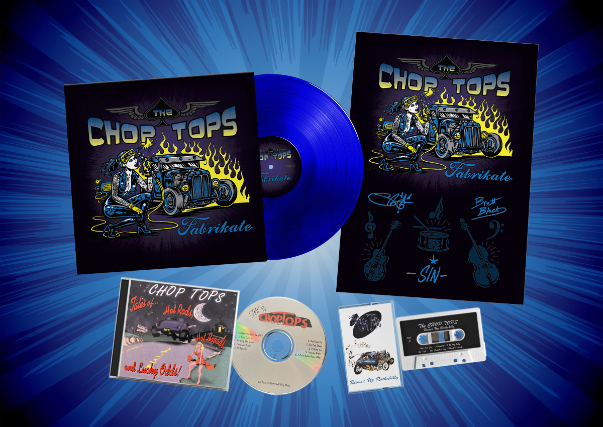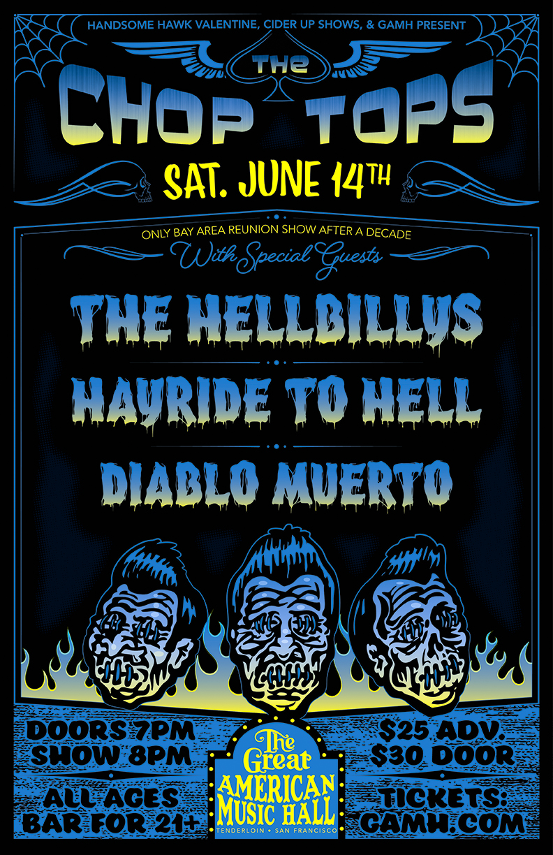 RESULT: A fantastic vinyl record jacket and label were created. An updated website was launched. Three eye-popping, jaw-dropping designs were laid out on T-shirts and stickers. And a full year-long campaign of promotional print, and social media ads and videos for their reunion events were produce succsefully darwing sold out audiences. See the website: thechoptops.com