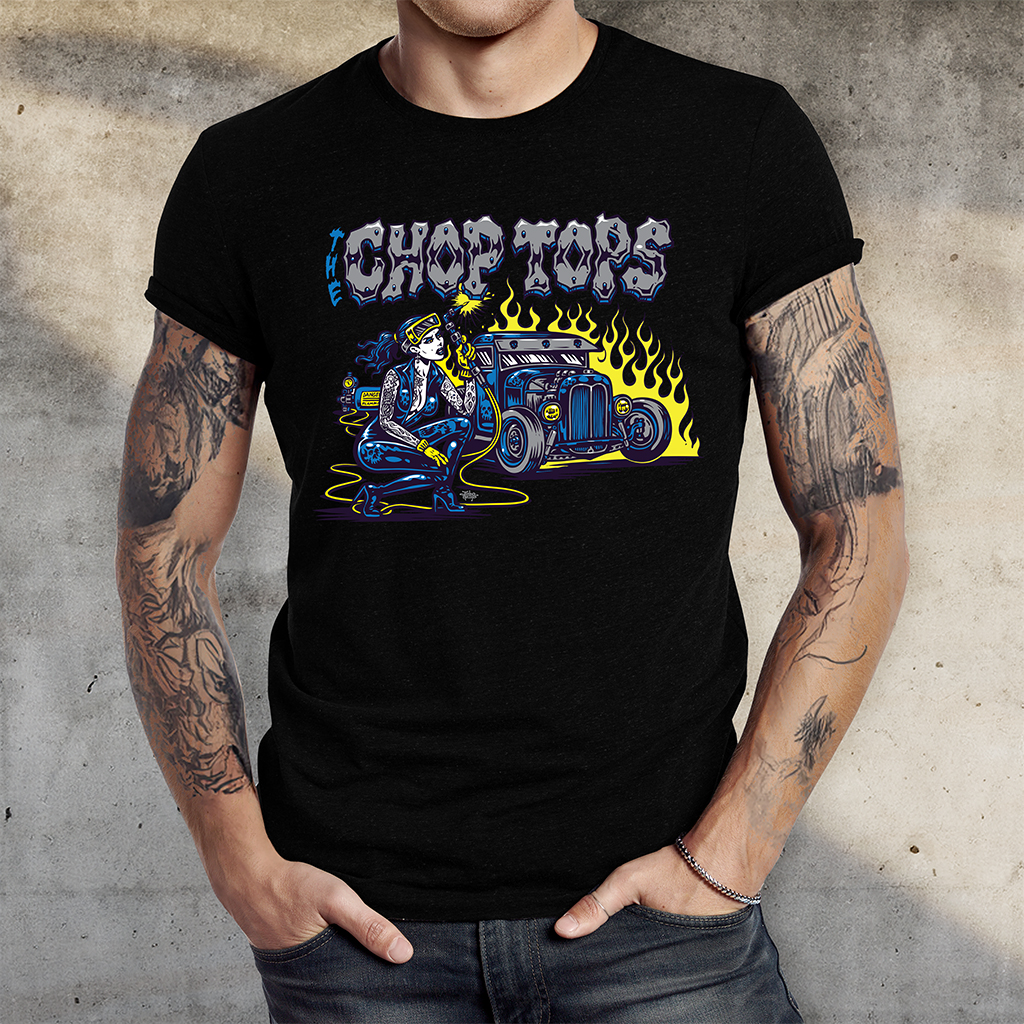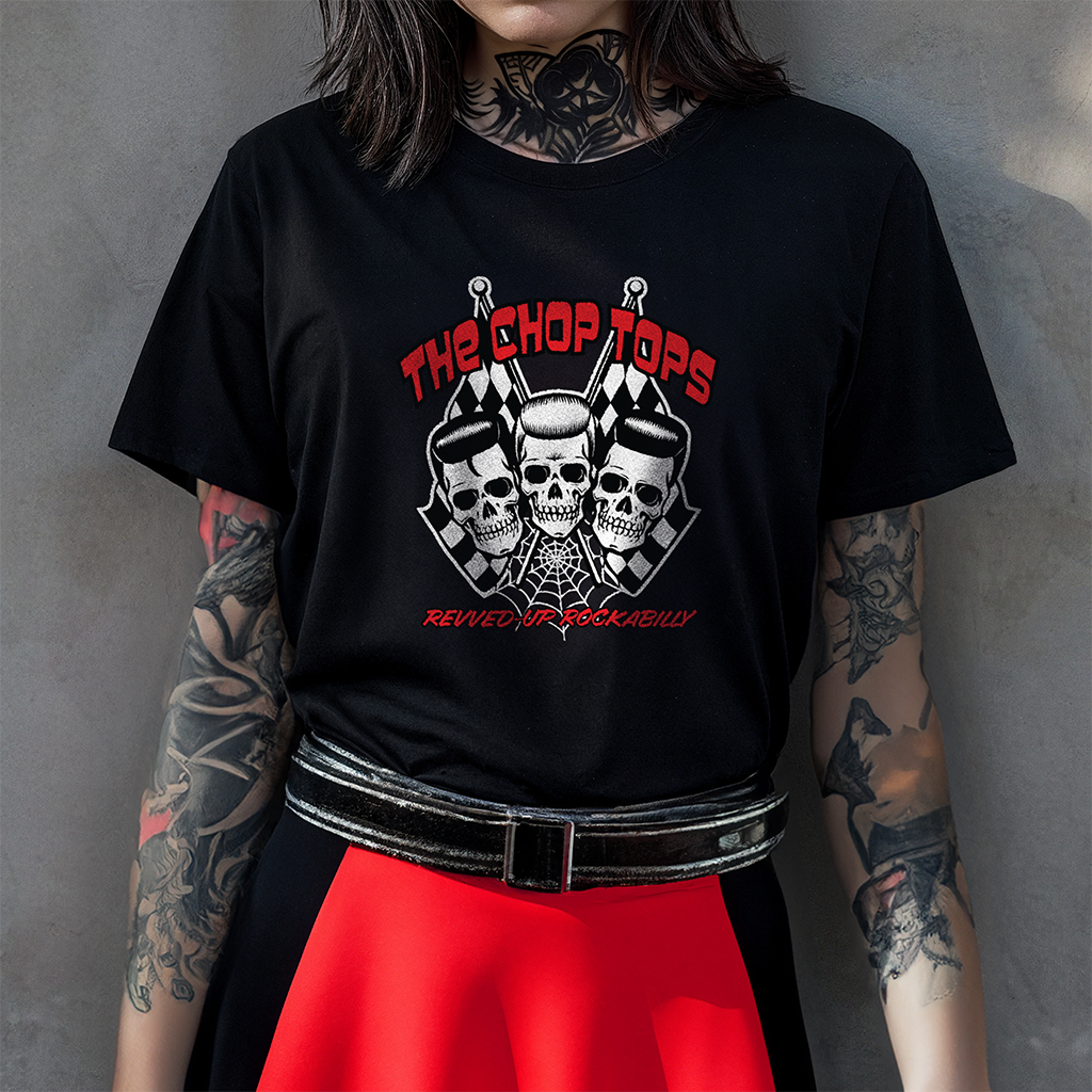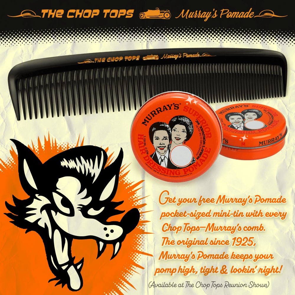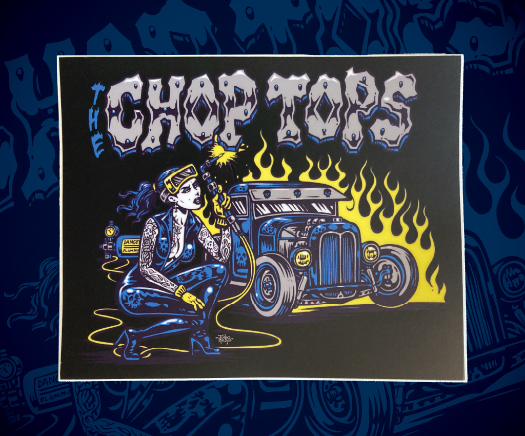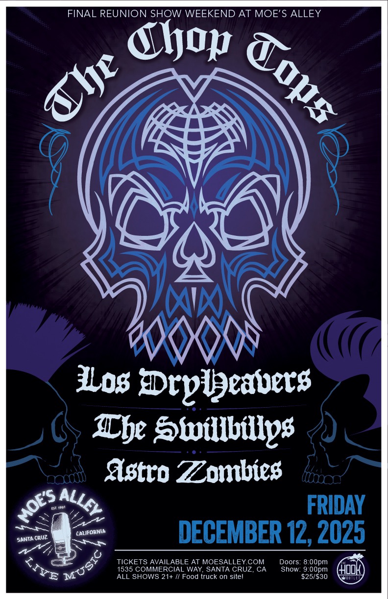 RESULT: A fantastic vinyl record jacket and label were created. An updated website was launched. Three eye-popping, jaw-dropping designs were laid out on T-shirts and stickers. And a full year-long campaign of promotional print, and social media ads and videos for their reunion events were produce succsefully darwing sold out audiences. See the website: thechoptops.com